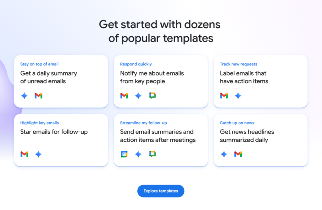 Google Workspace Studio cung cấp các template có sẵn cho các trường hợp sử dụng phổ biến. Bạn có hai tùy chọn: